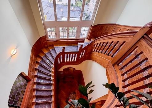 Der edle Parkettboden und die denkmalgerecht aufgearbeiteten Holzfenster unterstreichen das stilvolle Ambiente. Moderne technische Ausstattung fügt sich harmonisch in die historische Bausubstanz ein: Glasfaseranschluss, Bodentanks, ein klimatisierter Serverraum sowie eine Alarmanlage und das Fibaro Smarthome System.