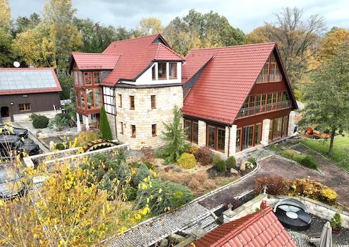 In absoluter Alleinlage auf einem rund 10 ha großen historischen Mühlenareal zeigt sich dieses villenähnliche Domizil mit ca. 1000 m² Wohn- und Nutzfläche. Modernster Komfort trifft auf einmalige Mühlendetails: Ein durch das Haupthaus fließender Mühlengraben und das erneuerte Mühlenrad setzen eindrucksvolle Akzente. Das Anwesen umfasst das große Haupthaus, ein denkmalgeschütztes Gästehaus mit integrierter Garage, ein Heizhaus, ein Grillareal und einen eigenen Saunabereich mit Tauchbecken. Der offene Wohn-Essbereich, mehrere luxuriöse Bäder und edle Materialien schaffen sowohl repräsentative als auch private Rückzugsräume – ein Refugium, das Natur, Geschichte und gehobenes Wohnen auf besondere Weise verbindet.
