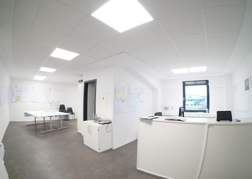 Die Einheit hat eine Rastereinbaudecke mit LED Leuchten und ist via Kabelkanälen vernetzt.