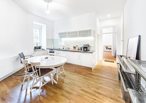 Die großzügig gestaltete, offene Küche ist vollständig ausgestattet mit einem Backofen, Ceranfeld, einem Kühlschrank sowie einer Geschirrspülmaschine und bietet Ihnen zudem genügend Stellraum für einen großen Esszimmertisch, welcher sich ebenfalls auch hervorragend als Besprechungsort nutzen lässt.