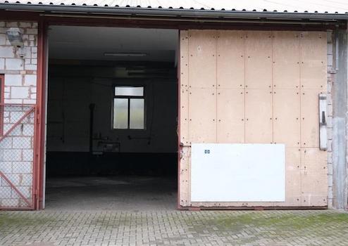 Halle, Höhe: 3,86 m, Tor: 3,86 m hoch und 3,99 m breit, 100 qm, geeignet als Lager und für Produktion. Strom + Wasser vorhanden. Es gibt keine Heizung.