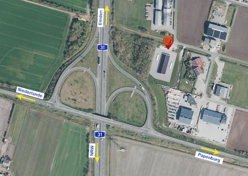Direkt an der A31 in der Nähe der holländischen Grenze (ca. 3 km) liegt das Gewerbegebiet. Der Autobahnzubringer ist nur wenige Fahrminuten entfernt. Die Autobahn führt in nördliche Richtung zur Nordseeküste und weiter Richtung Oldenburg/Bremen. In Südliche Richtung für die A31 direkt nach Nordrhein-Westfalen bzw. ins Ruhrgebiet. Die Stadt Papenburg mit der Meyer Werft ist nur wenige Kilometer (ca. 12 km ) entfernt.