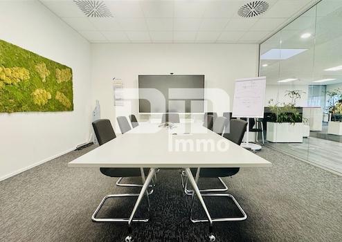 Ein zusätzlicher Pavillon BJ 1984 beherbergt weitere Sozialräume in Form eines vollausgestatteten Fitnessraumes, Teeküche, Ausstellung mit abgetrenntem Empfang, zwei WC-Räumen und Terrasse BJ 2023 mit Lamellendach und Bankiraiboden.