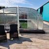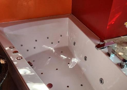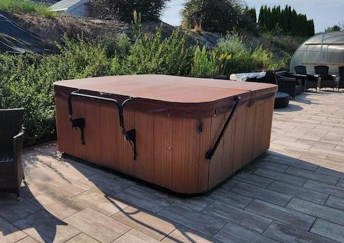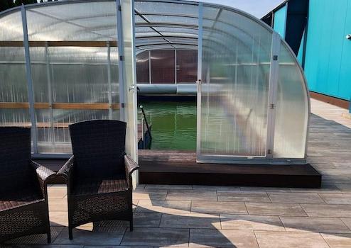 -Außenbereich mit Jacuzzi und überdachtem Pool