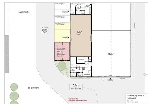 Zusätzlich kann ein Bürocontainer mit Wasser- und Stromanschluss, der direkt an der Halle steht, dazu angemietet werden. Weitere Freiflächen und/oder Stellplätze sind ebenfalls ergänzend anmietbar.