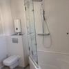 Das Bad ist weiß gefliest, mit Eckbadewanne und Duschabtrennung sowie Anschlüssen für Waschmaschine und Trockner. Waschtisch, Spiegel, Armaturen etc. sind bereits montiert.