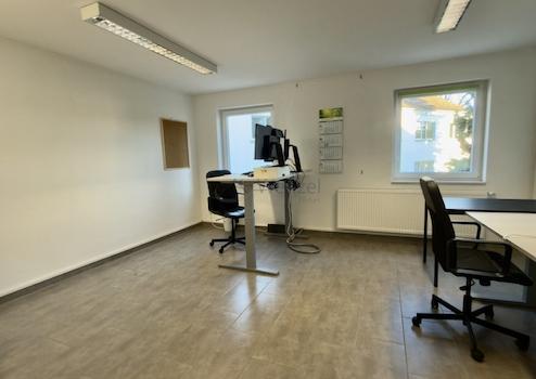 Über zwei Etagen erstreckt sich die Einheit, bestehend aus vier Büroräumen, einer Küche, WC-Anlage, Dusche, Abstellräumen, Lager, Fluren und einer großen, geräumigen Garage mit Sektionaltor.