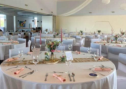 Unterschiedliche Anordnungen des Mobiliars lassen je nach Anlass variable Gestaltungen zu. Insgesamt sind Restaurant und Saal für bis zu 230 Personen zugelassen.