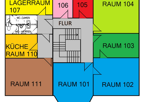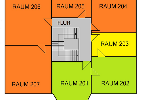 Raum 101, Raum 102 in 1.OG und 204, 206 und 207 im 2.OG- siehe Grundriss.