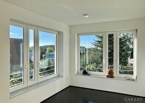 Im Wohn-/Ess-/Küchenbereich, der offen gestaltet ist, sorgt ein Kaminofen für angenehme Wärme und die großen Fensterflächen sorgen für ein helles Raumgefühl.