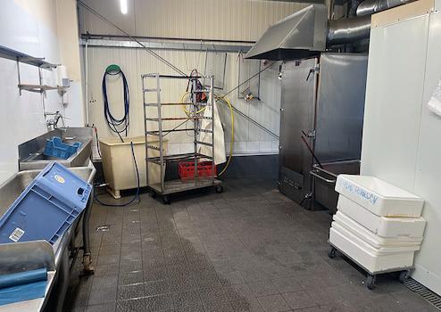 Aufteilung: Restaurant (Verkaufsraum), warme Küche, kalte Küche, Mitarbeiterküche (Aufenthaltsraum), Produktionsraum, Büro, Herren-WC, Damen-WC, Mitarbeiter-WC, Heizungsraum, Räucherei mit Gefrier- und Kühlhaus, Lager, große Halle
