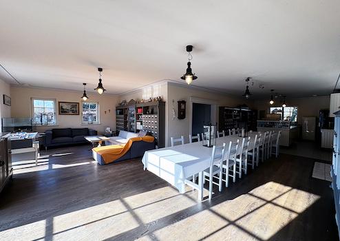 Erdgeschoss: Offener Wohn-, Ess- und Küchenbereich (mit wassergeführtem Holzkamin), Gästezimmer (respektive Büro), Diele, Bad (mit ebenerdiger Dusche, Waschtisch, WC und Pissoir)