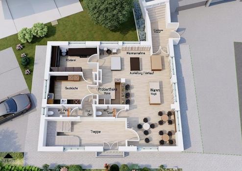 Der beigefügte Grundriss (Entwurf V1 für eine Kaffeerösterei) dient als Orientierung und kann angepasst werden. Die aktuelle Planung umfasst: