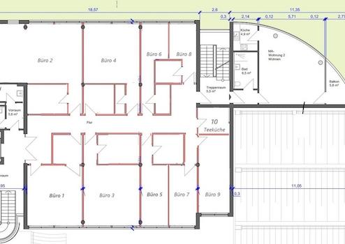 Sie können nur ein einzelnes, kleines Büro ab 15m² anmieten oder einen der beiden Etagen (je 240m²) gesamt. Für die Einzelbüros ist eine gemeinsame Teeküche vorhanden. Internet und Heizung ist in den Nebenkosten bereits enthalten.