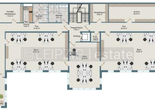 Die Etage verfügt aktuell über 6 helle Büroräume mit Flächen zwischen 12,7qm und 79 qm, 1 Küche, 2 getrennten Toiletten mit insgesamt 5 separierten WC, sowie 5 Abstellräume. Die 4 großen Büros eignen sich auch ideal als Schulungsräume.