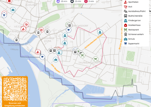 In fußläufiger Umgebung finden sich zahlreiche Einkaufsmöglichkeiten, darunter Supermärkte, Bäckereien, Apotheken und verschiedene Fachgeschäfte. Auch Cafés, Restaurants und der Vegesacker Hafen mit seiner schönen Promenade sind schnell erreichbar und laden zum Verweilen ein.