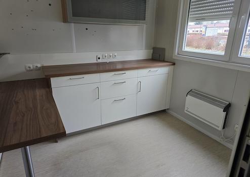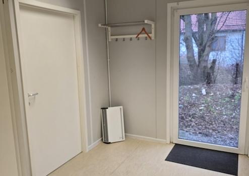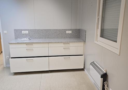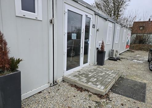 Eine ideale Anlage für Kleine (Tier) Arztpaxen, Steuerberater, Rechtsanwälte, Makler oder Existenzgründer und Kleinunternehmer - eine eingerichtetes Büro (oder wie bisher eine Praxis) bestehend aus 6 Modulcontainern, die am Standort fest miteinander verbunden sind (also nicht einzeln genutzt werden können). Jedes Modul hat die Maße 7,5m x 2,99m - also insgesamt eine Grundfläche von 135 qm. In den ersten beiden Modulen befindet sich ein Technikraum mit separatem Eingang, der Empfangsbereich, ein WC sowie ein Empfangstresen, sowie zwei kleinere Räume. Die beiden daran angrenzenden Module beherbergen zwei große (Behandlungs-) Räume, gefolgt von den letzten beiden Modulen mit zwei weiteren (kleineren) Räumen und einem Sozialraum. Das Objekt wurde bis vor kurzem als Tierarztpraxis genutzt und verfügt über das dafür notwendige (Küchen-)Mobliar, welches sehr gepflegt und hochwertig ist. Insgesamt sind neben dem Eingangstresen 5 Arbeitsbereiche mit fest eingebauten Küchenelemten vorhanden. Jeder Bereich ist im Arbeitsbereich mit Granitoberflächen ausgestattet. 4 Spülen sind in diesen Bereichen vorhanden. Im bisherigen Sozialbereich ist ebenfalls eine hochwertig ausgestatte Küche (inkl. Spüle, Kühlschrank, Spülmaschine, Mikrowelle und Herd) verbaut. Der Sozialraum verfügt über einen eigenen Eingang. Geheizt wird das Objekt mit Elektroheizungen. Warmes Wasser wird durch Durchlauferhitzer erzeugt. Im Eingangsbereich und einem der großen Behandlungsbereiche steht eine Klimaanlage zur Verfügung, die ohne Probleme auch erweitert werden kann (und auch als Heizung verwendet werden könnte). Die gesamte Einrichtung ist hochwertig und in einem sehr gepflegten Zustand. Die Decken sind teilweise mit Odenwaldelemeten abgehängt, wodurch weitere Installationen problemlos möglich sind. Der Boden besteht aus verklebtem Vinyl und ist gut erhalten. Es sind Anschlüsse für eine Waschmaschine vorhanden. Alle Fenster verfügen über eine Jalousie.