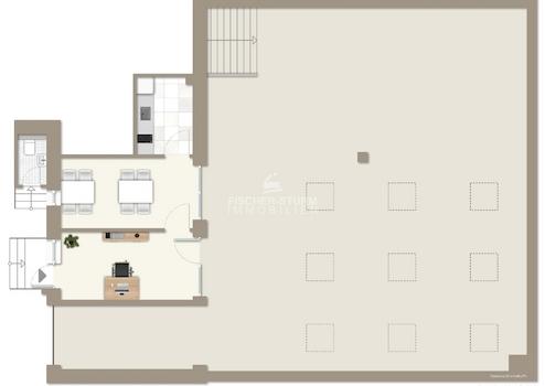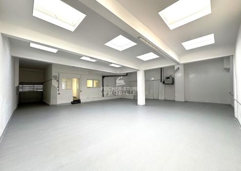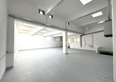 Eine breite Treppe führt von der gut über Dachfenster ausgeleuchteten Halle (ca. 154 m²) ins Untergeschoss. Hier befindet sich eine ca. 57 m² große Lagerfläche. Eine WC-Einheit (vom Hof zugänglich) gehört ebenfalls dazu.