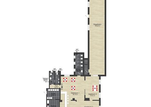 Die Gasträume 1 bis 3 sind funktional miteinander verbunden und bilden eine zusammenhängende Bewirtungsfläche, die sich flexibel für verschiedene Gastronomiekonzepte nutzen lässt. Direkt angeschlossen befindet sich eine rund 135 m² große Kegelbahn – ein Alleinstellungsmerkmal, das den Betrieb sowohl für Stammkundschaft als auch für Veranstaltungen besonders attraktiv macht.