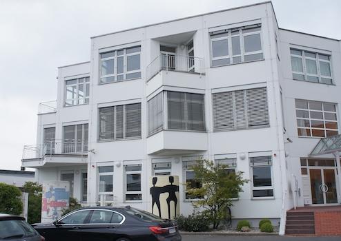 Das moderne, dreigeschossige Bürogebäude