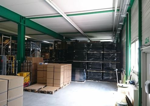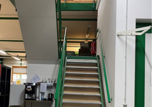 Die Halle verfügt über ein 4 Meter hohes und 3 Meter breites Rolltor, mit nach innen gebauter Schleuse mit Schnell-Lauftor. So verfügen sie über eine gute und barrierefreie Andienung. Mit dem Lastenaufzug, der über eine Tragkraft von 3 Tonnen verfügt, können sie problemlos ihre Waren in das rund 1.000 m² große Obergeschoss transportieren, welches über eine Deckenhöhe von 2,6 Metern verfügt. Im Erdgeschoss der Gewerbehalle integriert ist ein kleines Büro, mit Platz für 2 Arbeitsplätze.