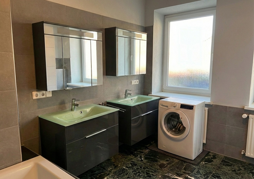 Es gibt ein großzügiges Bad mit bodentiefer Dusche, eine Badewanne und zwei