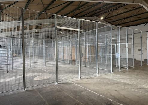 Die Storage-Boxen sind innerhalb der bestehenden Lagerhalle durch stabile, industrielle Gitterabtrennungen voneinander separiert. Die Abtrennungen bestehen aus robusten Stahlgitterelementen mit einer Breite von ca. 3.600 mm und einer Höhe von ca. 3.500 mm und gewährleisten eine klare Trennung der einzelnen Einheiten sowie eine gute Übersicht innerhalb der Halle. Die Ausführung ist auf den dauerhaften Einsatz im gewerblichen Umfeld ausgelegt.
