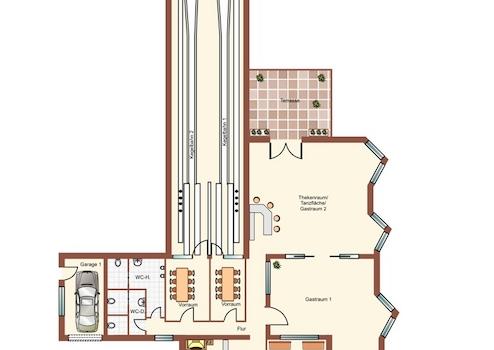 Insgesamt verfügt der Gastronomiebereich derzeitig über ca. 438 m² Nutzfläche und die Wohnung über ca. 75 m² Wohnfläche.