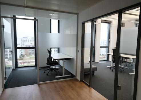 •14 höhenverstellbare Schreibtische, ergonomische Stühle, Meeting-Tische, Flatscreen und Silent-Telefonbox,
