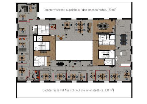 Neben der modernen Büroaustattung sorgen die zwei großen Dachterrassen von insgesamt 316m² für Staunen bei Mitarbeitern und Kunden. Genießen Sie die Mittagspausen oder planen SIe Events mit fabelhafter Kulisse der Duisburger City oder des Innenhafens mit Wasserblick .