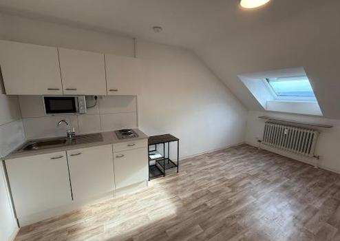 Wohn-/Schlafraum (PVC hell, 11,5 m²) mit neuer Küchenzeile (Doppelherd, Spüle mit Abtropfbecken, Mikrowelle), Küchenzeile mietfrei