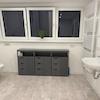 Gemeinschaftsflächen: Flur (Laminat hell, 7,4 m²/3 = 2,4 m²), Gemeinschaftsbad mit großer Dusche, WC und Doppelwaschbecken, elektr. Rolläden, sowie einem der Wohnung zugeteilten Badezimmerschrank (PVC hell, 8,5 m²/3 = 2,8 m² ),