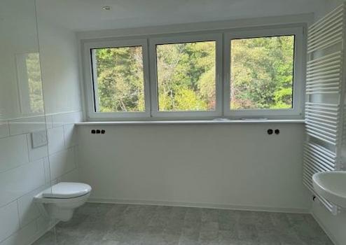 Die Wohnung befindet sich im Dachgeschoß am Hang und bietet mit den großen Kippfenstern (elektr. Rolladen) den weiten Blick über Bad Bocklet auf die gegenüberliegenden Hänge.