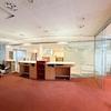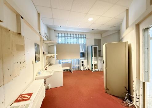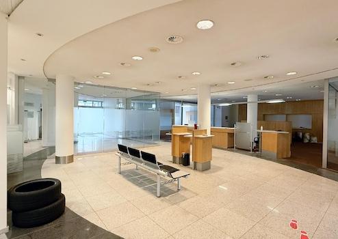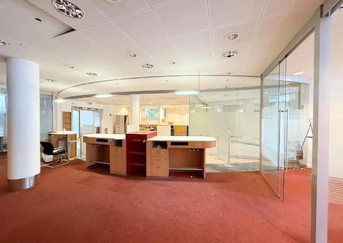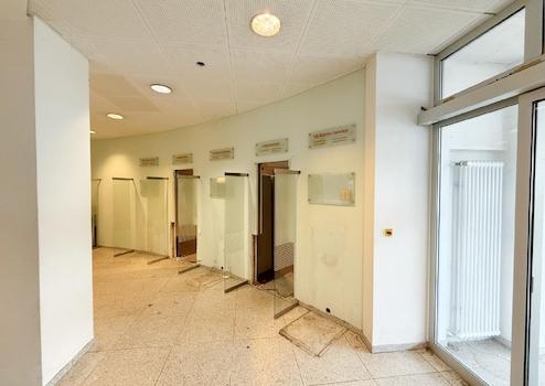 Diese großzügige, ehemals als Bankfiliale genutzte Einheit umfasst rund 440 m² und überzeugt mit einer klaren, kundenorientierten Raumstruktur. Der helle, nahezu ebenerdige Eingangsbereich öffnet sich zu einer weitläufigen Kundenhalle mit markantem Empfangs-/Schalterbereich und mehreren verglasten Beratungsboxen, die Diskretion bieten und zugleich Transparenz schaffen. Robuste Stein- bzw. Feinsteinböden im Publikumsbereich, roter textiler Belag in den Büros sowie abgehängte Lochrasterdecken mit integrierten Einbauleuchten und sichtbaren Auslässen der Raumlufttechnik prägen den professionellen Gesamteindruck. Rückwärtig gliedert sich die Fläche in funktionale Back-Office-Zonen, ruhige Einzel- und Teamräume, Besprechungszimmer sowie Archiv- und Technikflächen; eine interne Treppe bindet zusätzliche Nebenbereiche an und sorgt für kurze Wege im Arbeitsalltag. Die Sanitärbereiche sind hell gefliest, teilweise tagesbelichtet und getrennt angeordnet. Großzügige Fensterfronten bringen viel Tageslicht in die Räume, klassische Heizkörper sorgen für eine zuverlässige Beheizung. Frühere SB-Zonen der Bank etwa Konto-/Servicebereiche sind noch vorhanden und lassen sich je nach Bedarf weiterverwenden oder zurückbauen. Insgesamt präsentiert sich das Objekt in solidem, stellenweise modernisierungsbedürftigem Zustand und bietet damit hervorragende Voraussetzungen für eine zügige Inbetriebnahme bei gleichzeitig hoher Gestaltungsfreiheit. Ob Beratung, Kanzlei, Agentur, Praxis/Therapie, Bildung oder Showroom mit Empfang die überwiegend leichten Trennwände und die großzügigen Sichtachsen erlauben flexible Umbauten bis hin zu offenen Teamflächen oder zusätzlichen Meeting- und Schulungsräumen. Eine repräsentative Adresse mit viel Potenzial für moderne Dienstleistungs- und Büronutzungen.