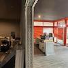 Ein dahinterliegender Büroraum sowie ein separater Hintereingang ermöglichen eine optimale Trennung von Kunden- und Mitarbeiterbereich. Von hier aus führt eine Treppe direkt ins Untergeschoss.