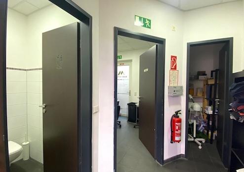 Nebenfläche mit Flur, Personalraum (mit Nebeneingang), drei WCs und einem Abstellraum