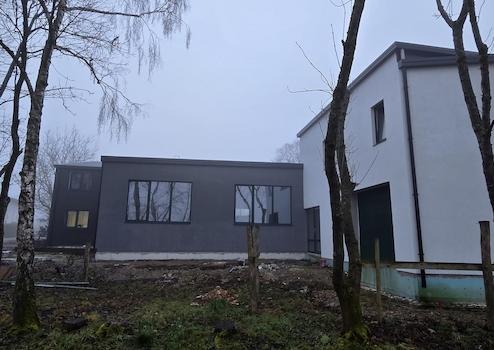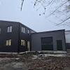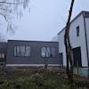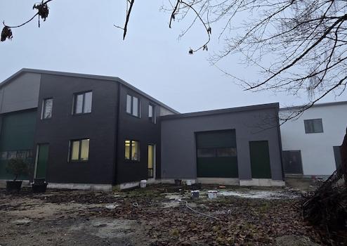 Moderne, klare Linienführung mit dunkler Hallenfassade und separater weißer Wohneinheit.