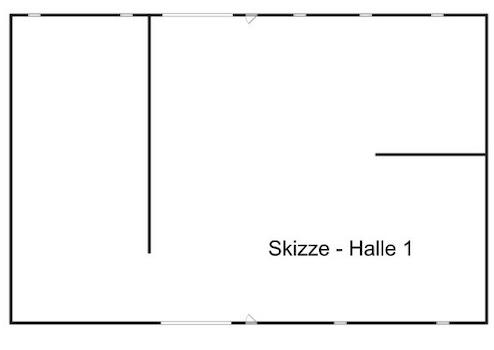 Die freitragende Halle 1 wurde in Betonbauweise errichtet und ist isoliert. Sie ist mit zwei Eingangstüren und zwei elektrisch betriebenen Sektionaltoren mit einer Breite von ca. 5,40 m und einer Höhe von ca. 4,80 m ausgestattet. Die Traufhöhe beträgt ca. 5 m, die Firsthöhe ca. 9 m. Eine Deckengrundbeleuchtung ist vorhanden.