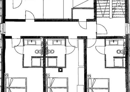 Das Obergeschoss ist über das geflieste Treppenhaus erreichbar. Der Zugang ins Treppenhaus ist sowohl von der Gaststube als auch über eine separate Eingangstüre für Gäste möglich. Hier befinden sich ein Abstellraum und vier Gästezimmer. Sie sind mit Teppichböden ausgelegt und verfügen über großzügige Vorräume mit Garderoben, moderne Duschbäder mit WCs, LCD-Fernseher und W-Lan.