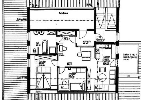 Im Dachgeschoss ist über einem Vorraum der Technikraum mit der Gaszentralheizung und dem Waschmaschinenanschluss sowie die Pächterwohnung erreichbar. Die Wohnung ist komplett mit Vinyl ausgelegt. Es sind viele moderne Glastüren und Deckenspots