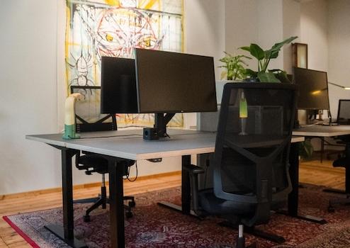 ⭐️ 6 Voll ausgestattete Arbeitsplätze, höhenverstellbar und mit mit 4K Monitoren (erweiterbar auf 8 Arbeitsplätze, max. 10)
