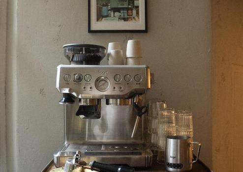 * Küchenausstattung mit Siebträgermaschine, Ofen/Grill, Herdplatte, Spülmaschine, Geschirr und Gläsern