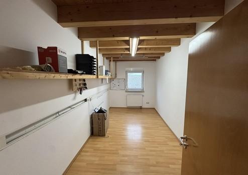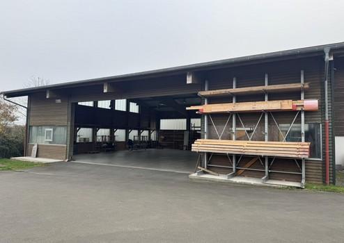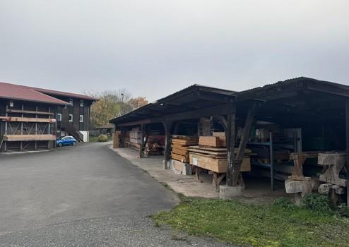 Der Bürobereich ist erhöht angeordnet und bietet einen direkten Blick über die gesamte Halle – eine Lösung, die sich in der früheren Nutzung als sehr praktisch erwiesen hat. Die angeschlossenen Sozialräume im Erdgeschoss bieten Aufenthalts- und Sanitärflächen für Mitarbeiter. Ergänzend zur Haupthalle verfügt die Immobilie über ein großes, offenes Holzlager mit rund 280 m², das flexibel für Lager- und Materialzwecke genutzt werden kann. Die weitläufigen Außenflächen sind größtenteils betoniert und bieten optimale Bedingungen für innerbetrieblichen Verkehr, Abstellflächen und Rangiermöglichkeiten.