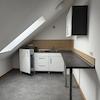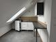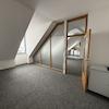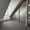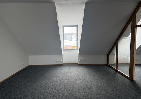 Beim Eintreten wirkt die Einheit hell und aufgeräumt. Große Fensterflächen und Dachschrägen sorgen für viel Tageslicht und eine angenehme Arbeitsatmosphäre. Der Boden ist überwiegend mit Teppich ausgestattet, was den Räumen eine ruhige Akustik gibt. Glaselemente mit Holzrahmen schaffen eine moderne, transparente Zonierung und trennen Bereiche, ohne sie optisch zu verkleinern.