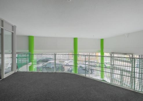 Der Lastenaufzug mit einer Tragkraft von bis zu 500 kg erleichtert den Transport zwischen den Ebenen. Außerdem verfügt das Hinterhaus über zusätzliche Büroflächen, die perfekt in die Gesamtfläche integriert sind.