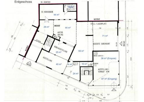 Im Vorderhaus erwarten Sie helle, einladende Räume mit großen Schaufenstern, eine Empore für zusätzliche Arbeits- oder Präsentationsfläche, ein Büro, Teeküche und Lagerflächen im Untergeschoss. Über den Innenhof gelangen Sie zum Hinterhaus, das weitere großzügige Lagerflächen sowie eine separate Halle mit ca. 71 m² und einer Deckenhöhe von 4,00 m bietet.