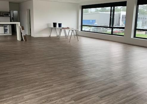 Die Bürofläche ist sehr hell durch große Fensterfronten, verfügt über einen modernen Boden in Holzoptik und bietet ein angenehmes, professionelles Arbeitsumfeld.