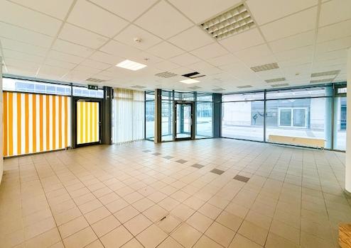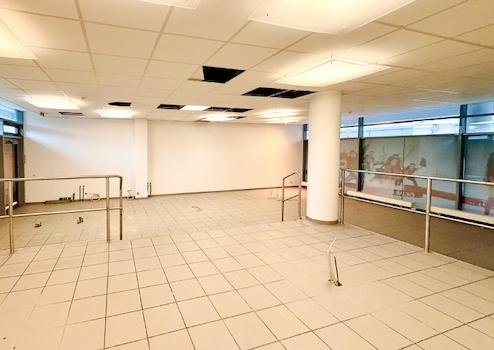 Die großzügige Schaufensterfront lässt viel Tageslicht in die Räume, während der pflegeleichte Fliesenboden und die Akustikdecke ein angenehmes Arbeitsumfeld schaffen. Die Beleuchtung ist funktional und unterstützt eine produktive Arbeitsatmosphäre.