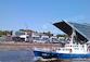 Dockland - ein Bürohaus in der Elbe: Auf einer extra aufgeschütteten Landzunge in der Elbe entstand Hamburgs ungewöhnlichstes Bürohaus. Ein Haus aus Stahl und Glas, das wie der Bug eines Schiffes 40 m weit nach Westen übers Wasser hinausragt. Vom Strom her, so die Planer, wirkt das Dockland, die schräg dahinter auf ihre Verladung wartenden Container sowie das weiter östlich liegende Fährterminal wie ein gigantischer Containerfrachter.
