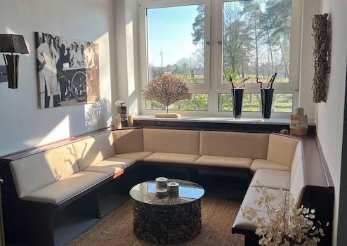 Das ehemalige Offizierscasino der Deutschen Bundeswehr liegt am Rand des Münsterlandes in dem Industrie- und Gewerbegebiet "Industriepark Nord.Westfalen" in Coesfeld-Flamschen und genau Mittendrin eines Naturschutzgebietes, "Die Grüne Mitte". Der Blick ins Grünen mit freiweidenden Schafen ist es versichert.